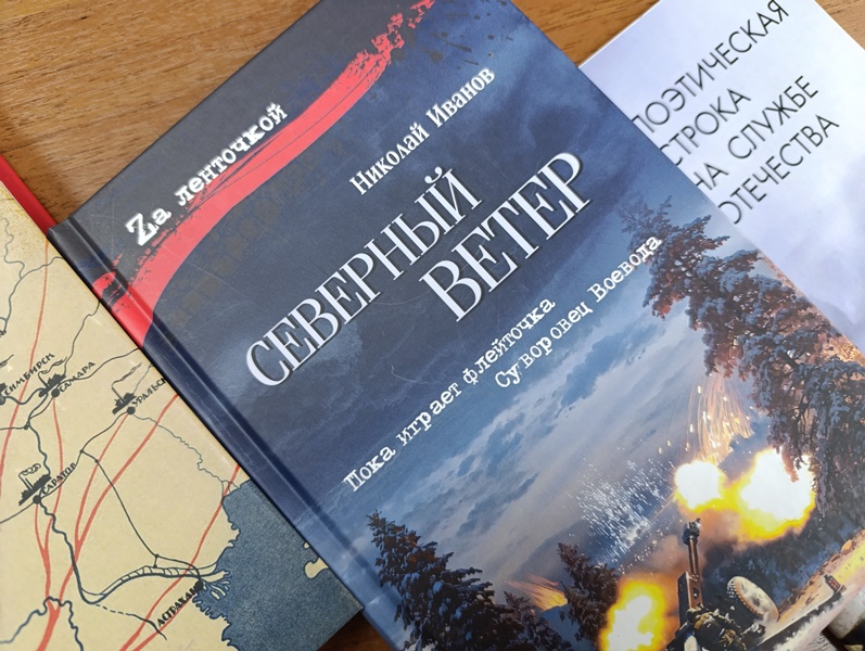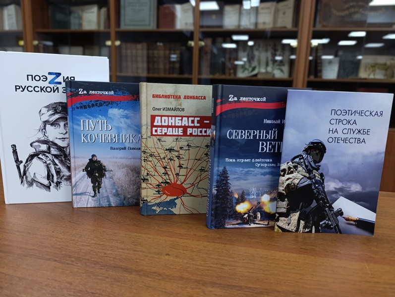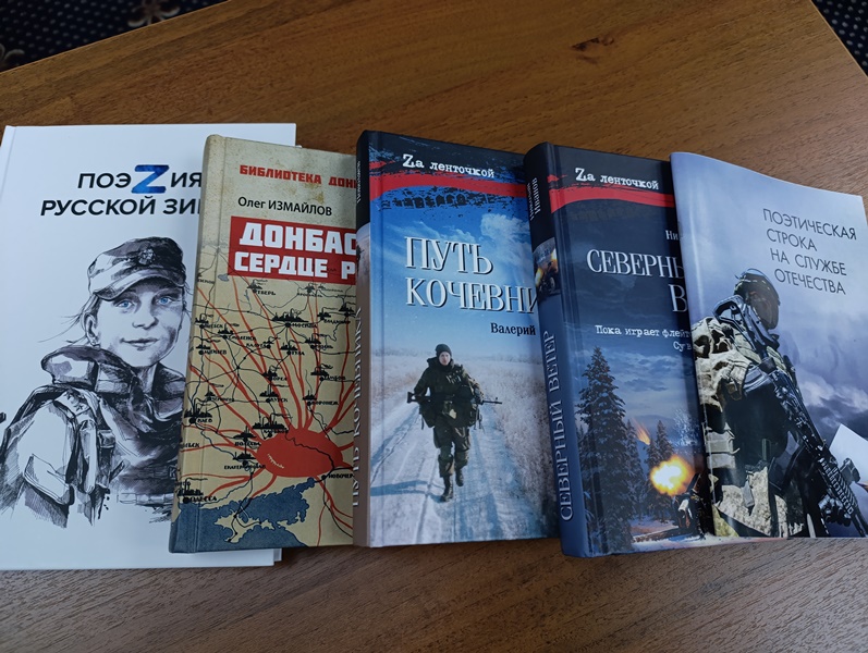 Книжный фонд библиотеки значительно расширился за счет поступления произведений, рассказывающих о подвигах наших солдат. Это сборники стихов "Поэтическая строка на службе Отечества" и "Поэзия русской зимы". Военные повести Николая Иванова "Северный ветер" и Валерия Поволяева "Путь кочевника (История одной жизни)" и автобиагрофическая книга писателя и журналиста Олега Измайлова "Донбасс - сердце России".