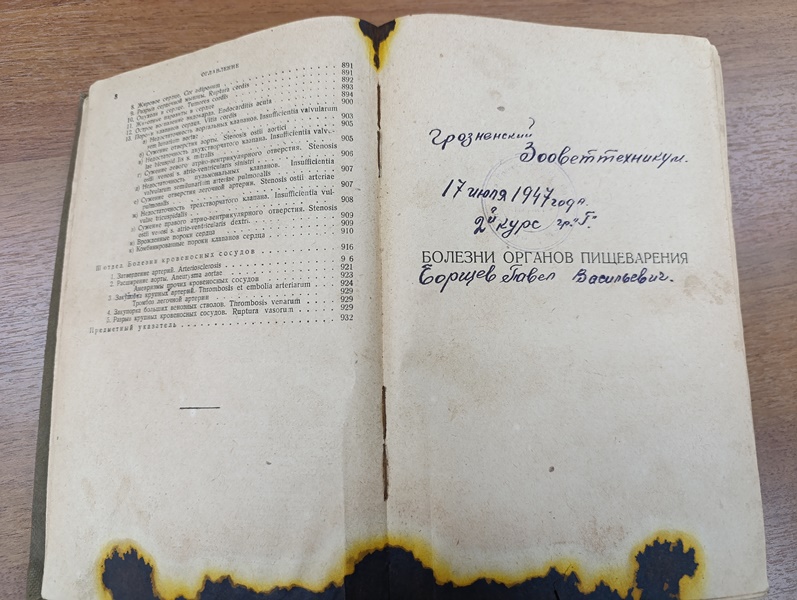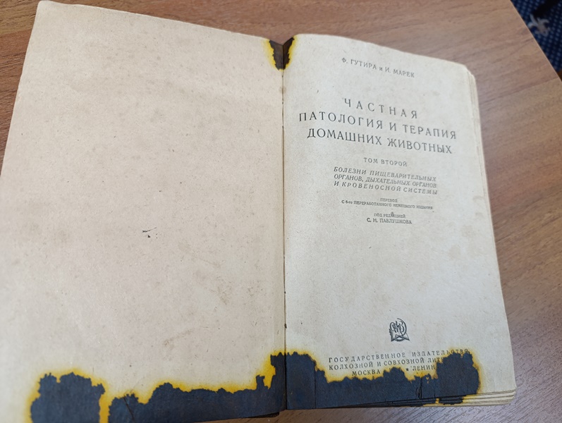 Александр Владимирович передал в фонд библиотеки редкое издание — второй том труда Ф. Гутира «Частная патология и терапия домашних животных». Книга была выпущена в 1935 году Государственным издательством колхозной и совхозной литературы (Москва) и содержит 932 страницы.